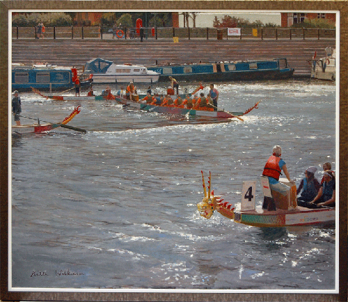 “Sparkling Light – Nottingham Riverside Festival”, a painting that I have been working on for the last couple of months, has just been awarded the Holbrook Trust first prize at the Nottingham society of Artists autumn exhibition. The development of the painting, which depicts the dragon boat racing from the Nottingham Riverside Festival, can be tracked on my painting blog The Filbert and Rigger. . Naturally, I also framed the picture and after toying with the idea of a hand-gilded frame I eventually opted for a modern chunky moulding in a pewter finish with a white slip.